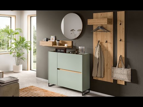 Das Garderobe Set Borga bringt modernes Design und Ordnung in Flur und Diele. Die 4-teilige, wandbefestigte Kombination in Salbei Grün mit Absetzungen in Artisan Eiche Melamin umfasst ein Regal mit offenem Fach und Ablage, einen hängenden Schuhschrank mit Schubkasten und Klappe sowie ein Garderobenpaneel mit Hutablage, Kleiderstange und zwei Haken. Highlight ist der runde, rahmenlose Garderobenspiegel mit verdeckter Befestigung. Griffloses Öffnen und Unterflurauszug sorgen für Komfort. Pflegeleichte Melaminoberflächen und FSC®-zertifizierter Holzwerkstoff stehen für Qualität und Nachhaltigkeit.