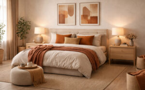 Auch bei der Farbgestaltung spielt die Reduktion eine wichtige Rolle. Erdtöne wie Beige, Sand oder Creme sind perfekte Grundfarben, die durch warme Nuancen wie Rostrot, Terrakotta oder Senfgelb ergänzt werden können. Diese Farben verleihen dem Raum Wärme und Gemütlichkeit, ohne dabei überladen zu wirken.