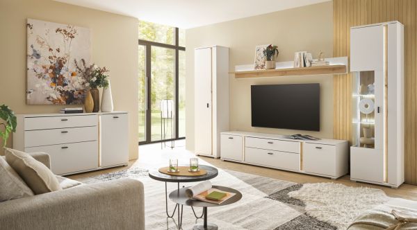 TV-Lowboard "Bellport" in weiß matt und Wotan Eiche TV Unterteil inklusive Frontbeleuchtung 200 cm