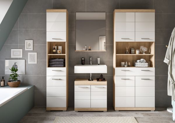 Badmöbel Set 4-teilig "Mambo" in weiß Hochglanz und Sonoma Eiche Badkombination 186 x 191 cm