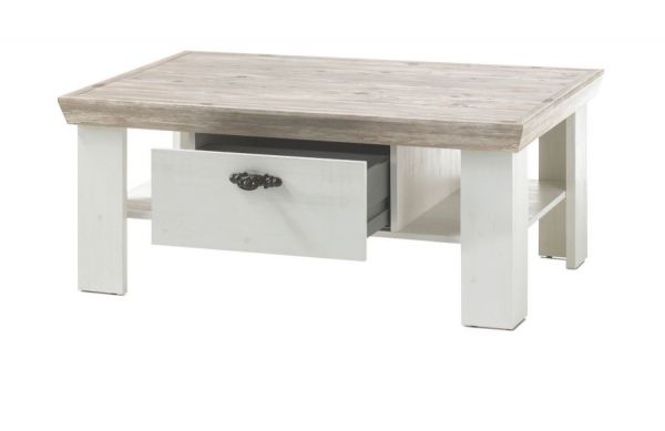Couchtisch "Rovola" in Pinie weiß / Oslo Pinie Landhaus Beistelltisch mit Ablage und 2 x Schubkasten 109 x 69 cm
