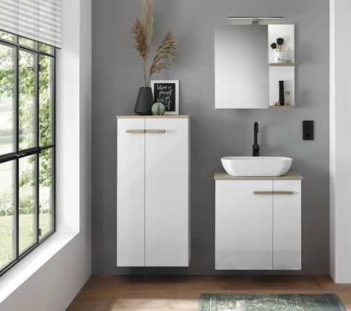 Badmöbel Set "Dense" in weiß Hochglanz Lack und Eiche Badkombination MIT Waschbecken und Badlampe 130 x 200 hängend / stehend
