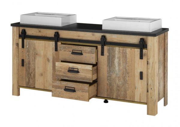 Badmöbel Set "Stove" in Used Wood hell und anthrazit Doppelwaschtisch MIT Waschbecken und LED Spiegellampe