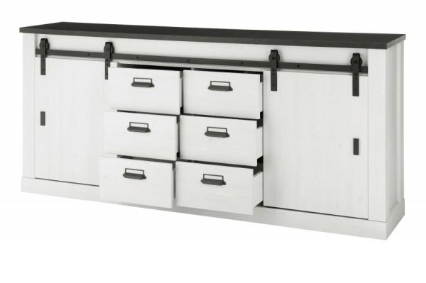 Sideboard "Stove" in weiß Pinie und anthrazit Landhaus Kommode 201 x 91 cm