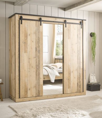 Kleiderschrank "Stove" in Used Wood hell und anthrazit Schiebetürentürenschrank 3-türig mit Spiegel 201 x 209